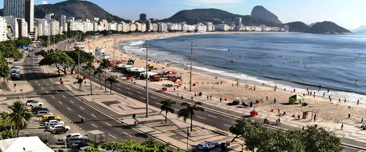 Copacabana beach – Rio de Janeiro’s most beautiful beach curves 4,5 km from one end, at Posto 6, where this panorama webcam is located nearby Copacabana Fort, to the other end, where you see the sugar loaf.